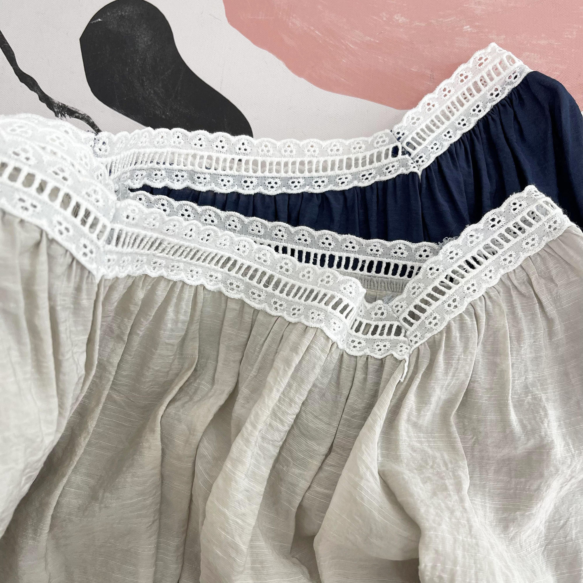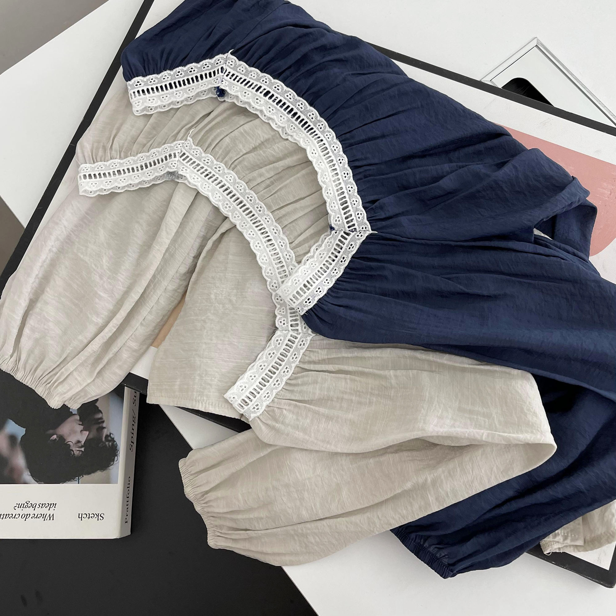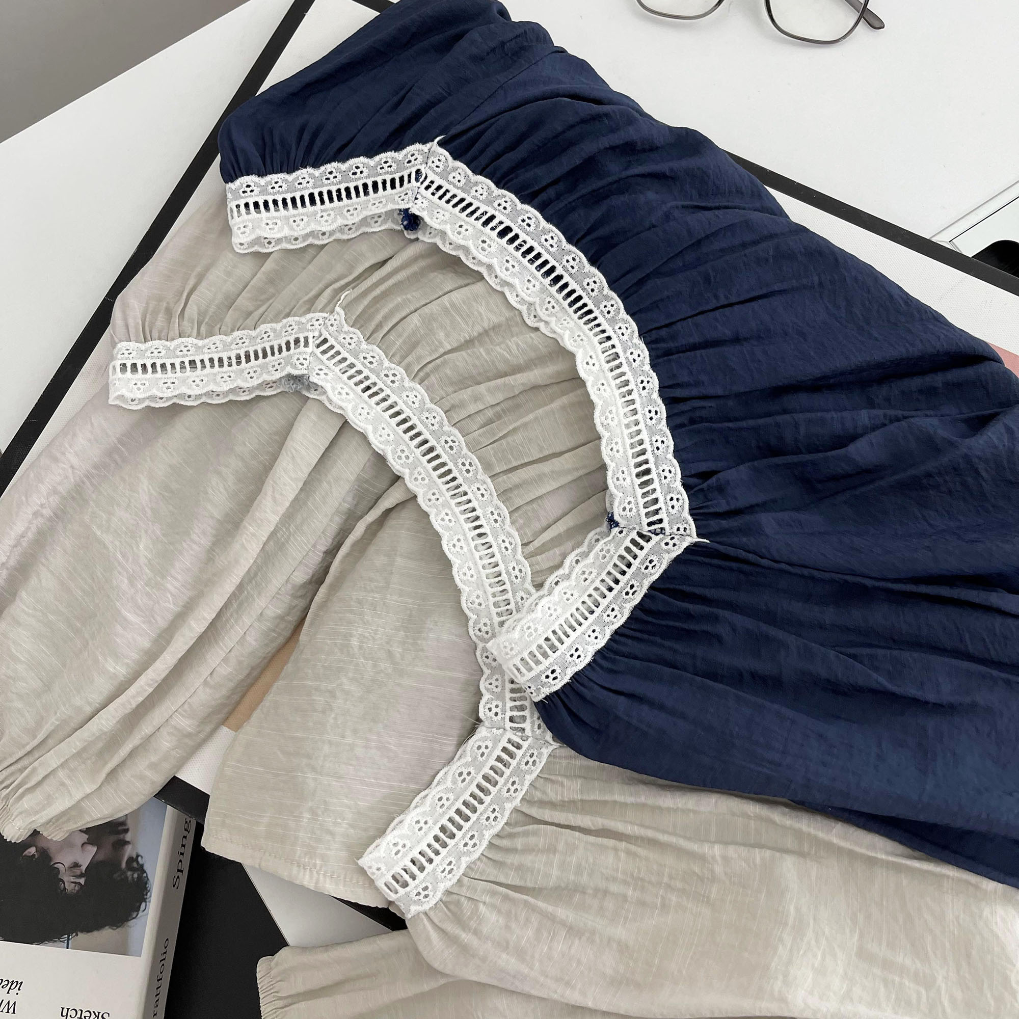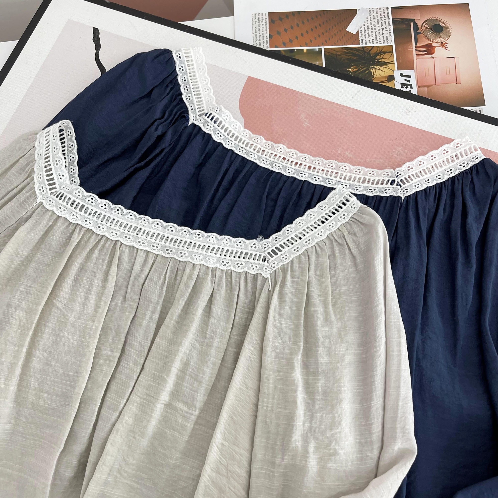 P23403 เสื้อแฟชั่น ผ้าสังเคราะห์เนื้อดี คอแต่งขลิบลูกไม้ 2 สี เทาอ่อน น้ำเงิน