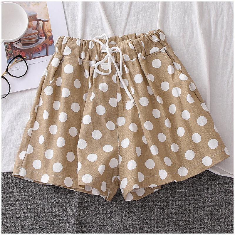 P9319 กางเกงขาสั้น ผ้าฝ้ายลายจุด เอวยืดกระเป๋าข้าง สีดำ น้ำตาล